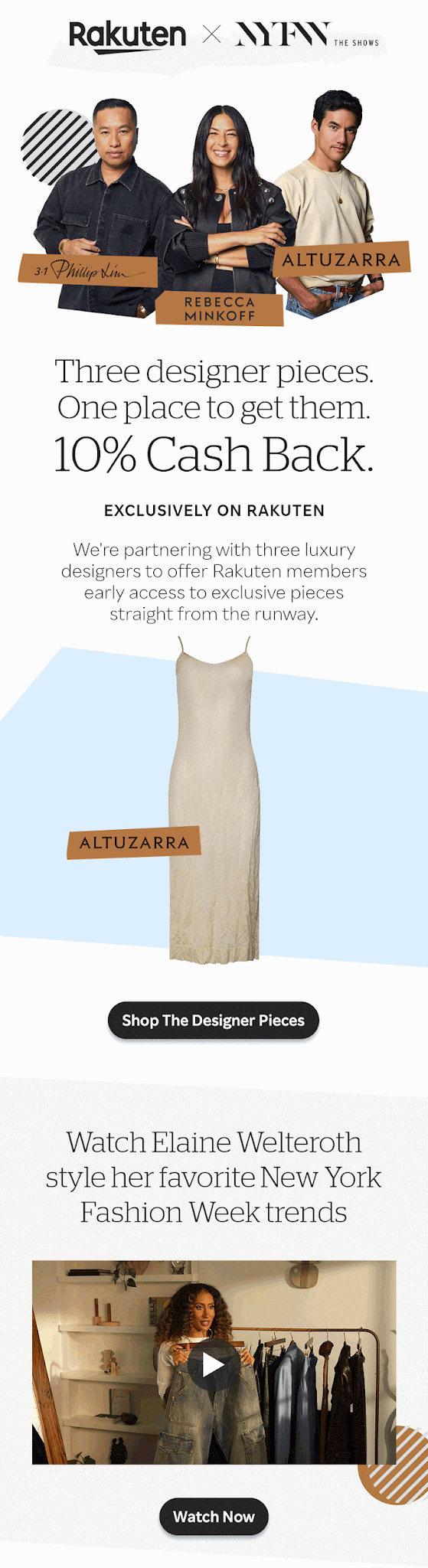 Rakuten teamed up with New York Fashion Week for an exclusive collaboration that brought the catwalk to our members’ closets. NYFW designers and a top fashion influencer introduced millennial shoppers to Rakuten’s lineup of high-end fashion brands, and showed them how Cash Back makes luxury a little more affordable. With a 10% Cash Back promotion driving the experience, shoppers went from inspiration to purchase—seeing firsthand how Rakuten makes it easier to buy the pieces they love. This multifaceted program unfolded across several creative touchpoints—scroll down to see how each one brought the campaign to life.